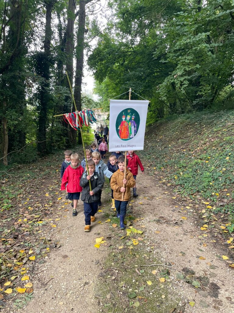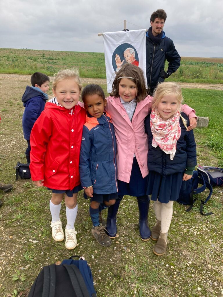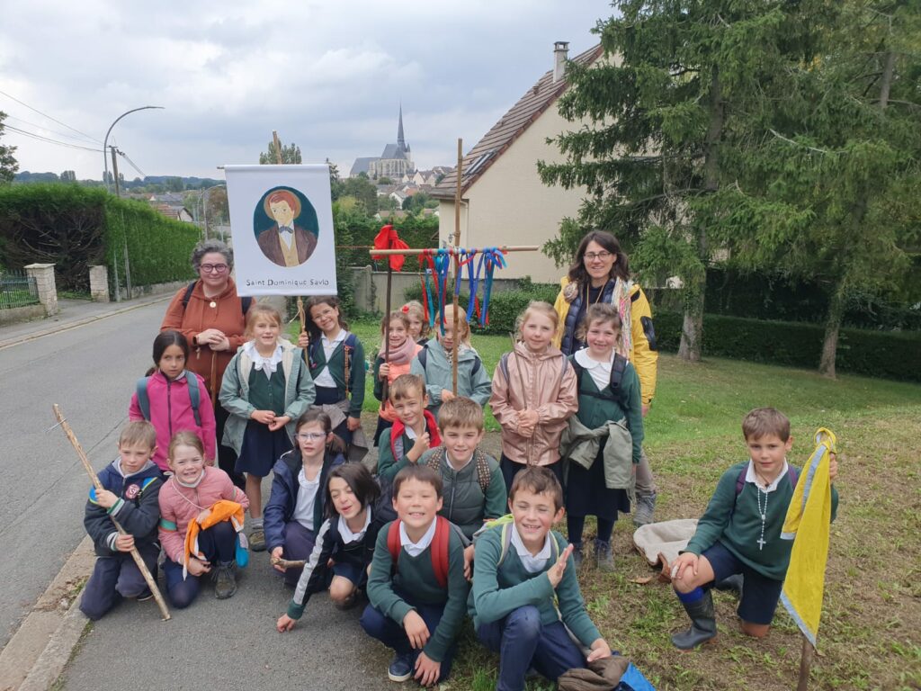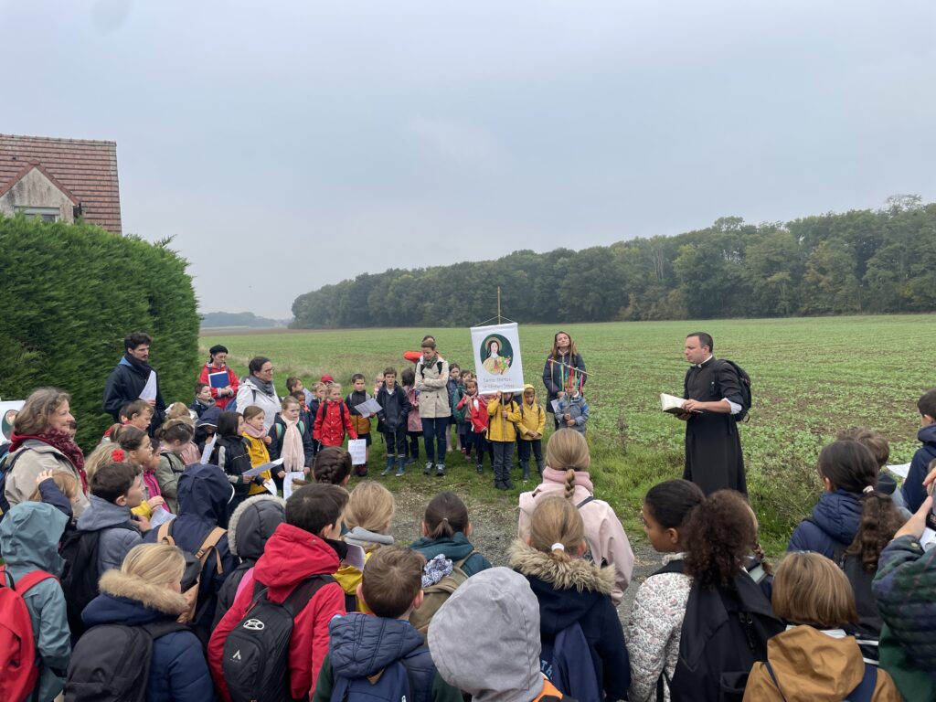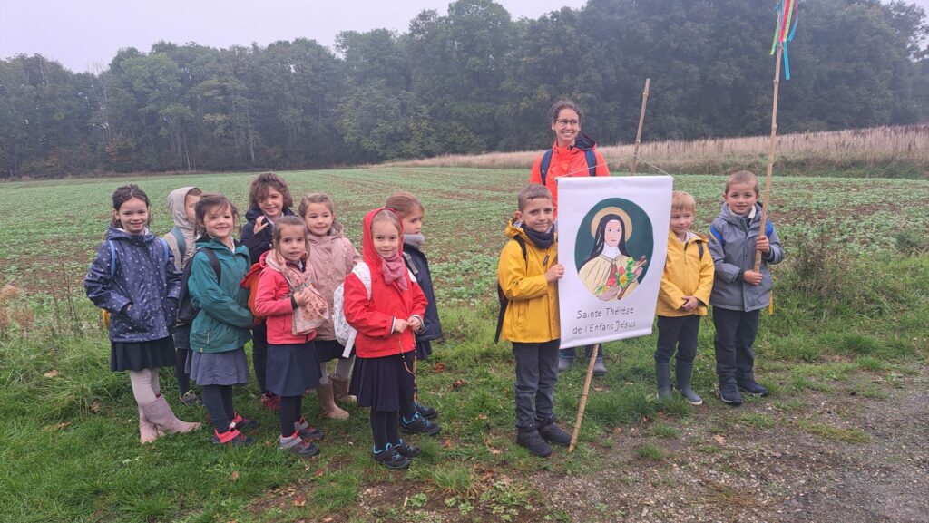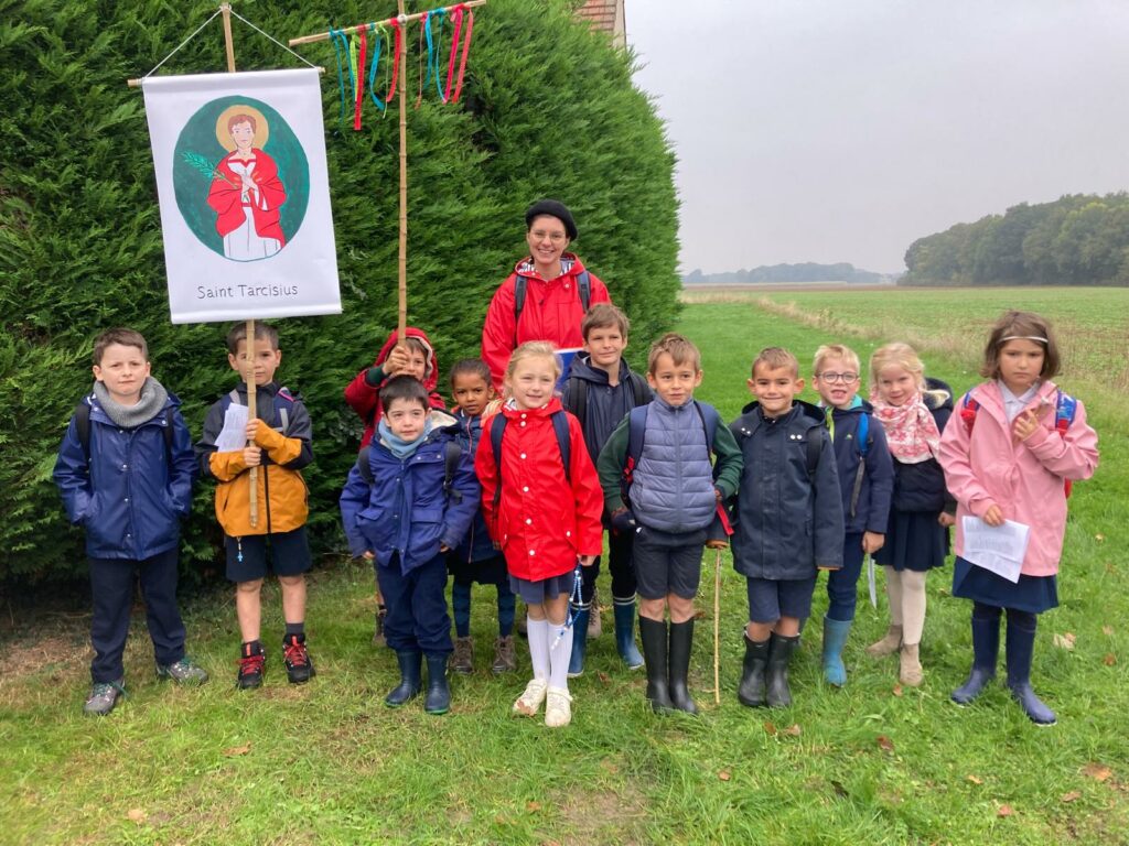 Ce matin-là, malgré un ciel un peu gris et lourd, les enfants avaient des étoiles dans les yeux. Dans chaque classe, le saint patron ouvrait la marche, ainsi que la croix d’intention de prière, portés fièrement par quelques élèves, comme pour guider ses petits pèlerins vers le sanctuaire de la Miséricorde à Gallardon. Les bottes claquaient sur le chemin, les petits sacs à dos rebondissaient, mais personne ne se plaignait : l’aventure commençait !