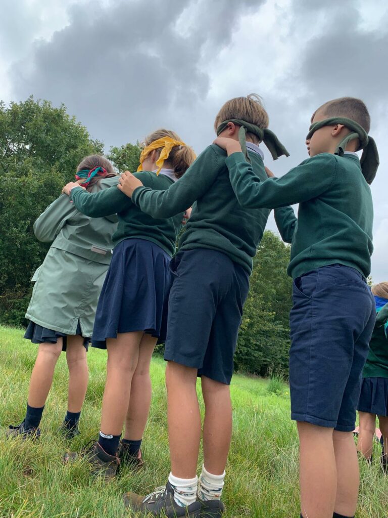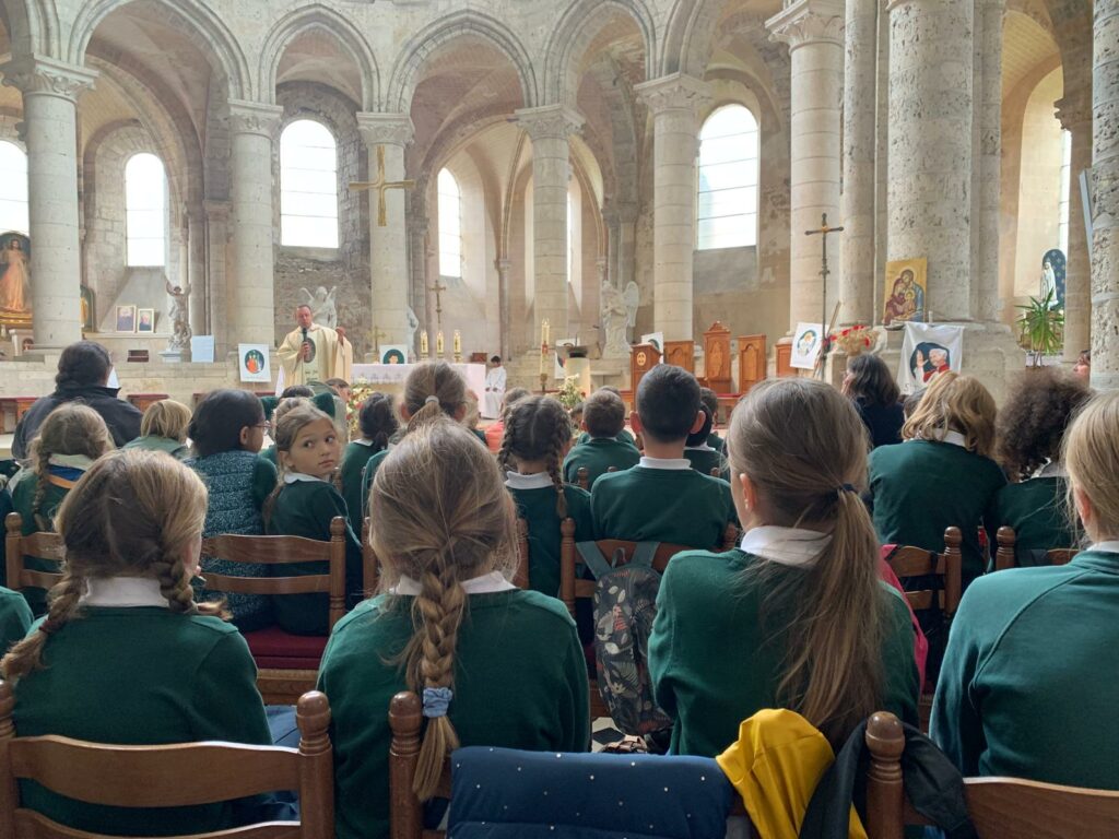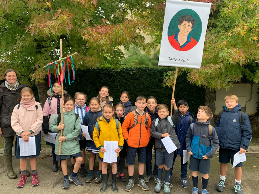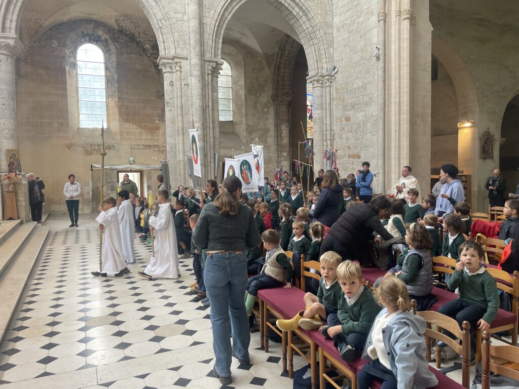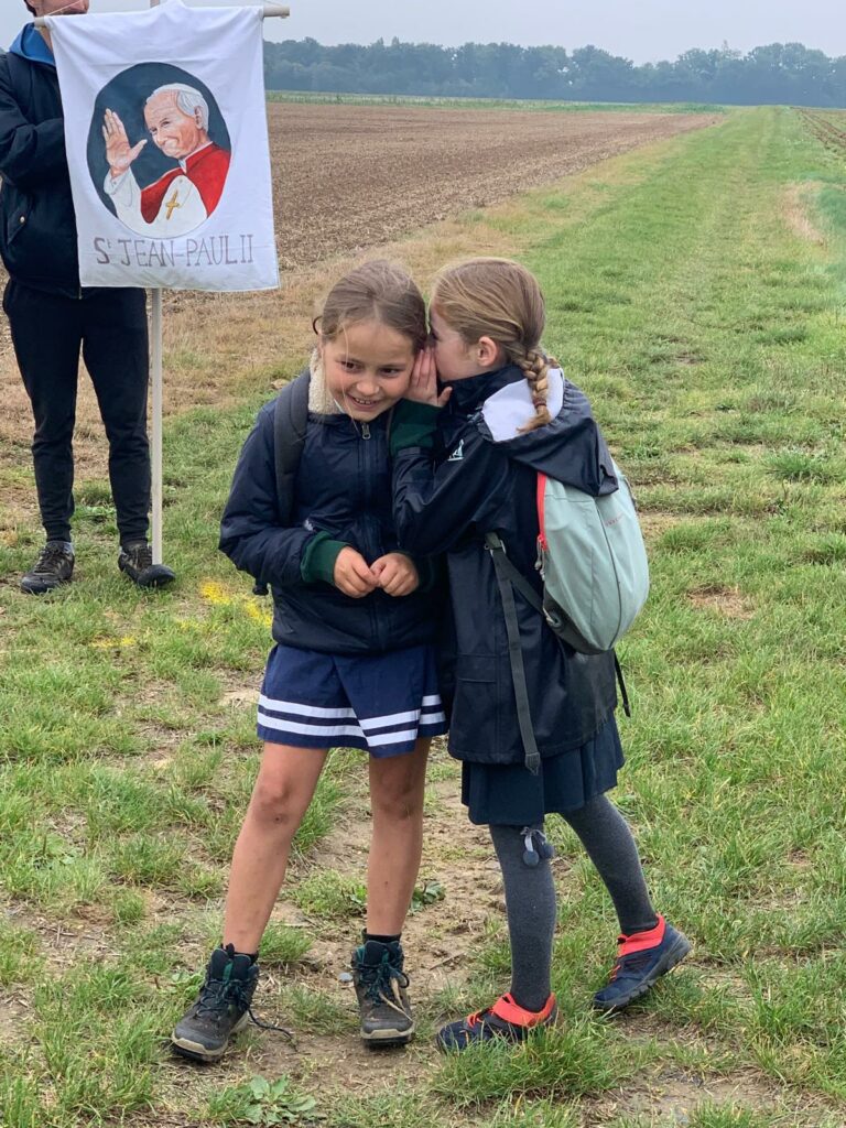 Ce matin-là, malgré un ciel un peu gris et lourd, les enfants avaient des étoiles dans les yeux. Dans chaque classe, le saint patron ouvrait la marche, ainsi que la croix d’intention de prière, portés fièrement par quelques élèves, comme pour guider ses petits pèlerins vers le sanctuaire de la Miséricorde à Gallardon. Les bottes claquaient sur le chemin, les petits sacs à dos rebondissaient, mais personne ne se plaignait : l’aventure commençait !