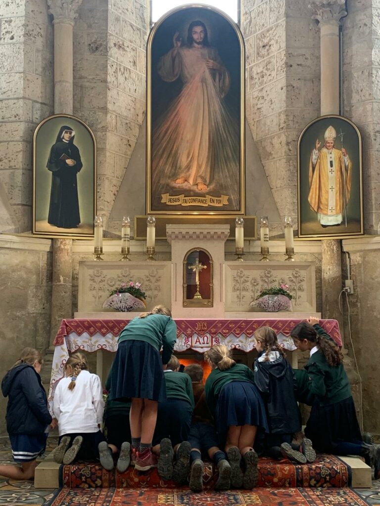 Le moment le plus attendu arriva enfin : l’entrée dans le sanctuaire. Là, ils découvrirent la chapelle de la miséricorde et les reliques de sainte Faustine, saint Jean Paul 2 et saint Stanislas de Pologne devant lesquelles ils récitèrent le chapelet de la miséricorde (ci-dessous), puis la messe fut célébrée par l’aumônier de l’école. Dans le silence recueilli, les enfants qui quelques instants plus tôt chantaient à pleins poumons se tenaient droits, les yeux brillants. C’était le sommet de cette journée, un instant de grâce après une marche remplie de joie et de fraternité.